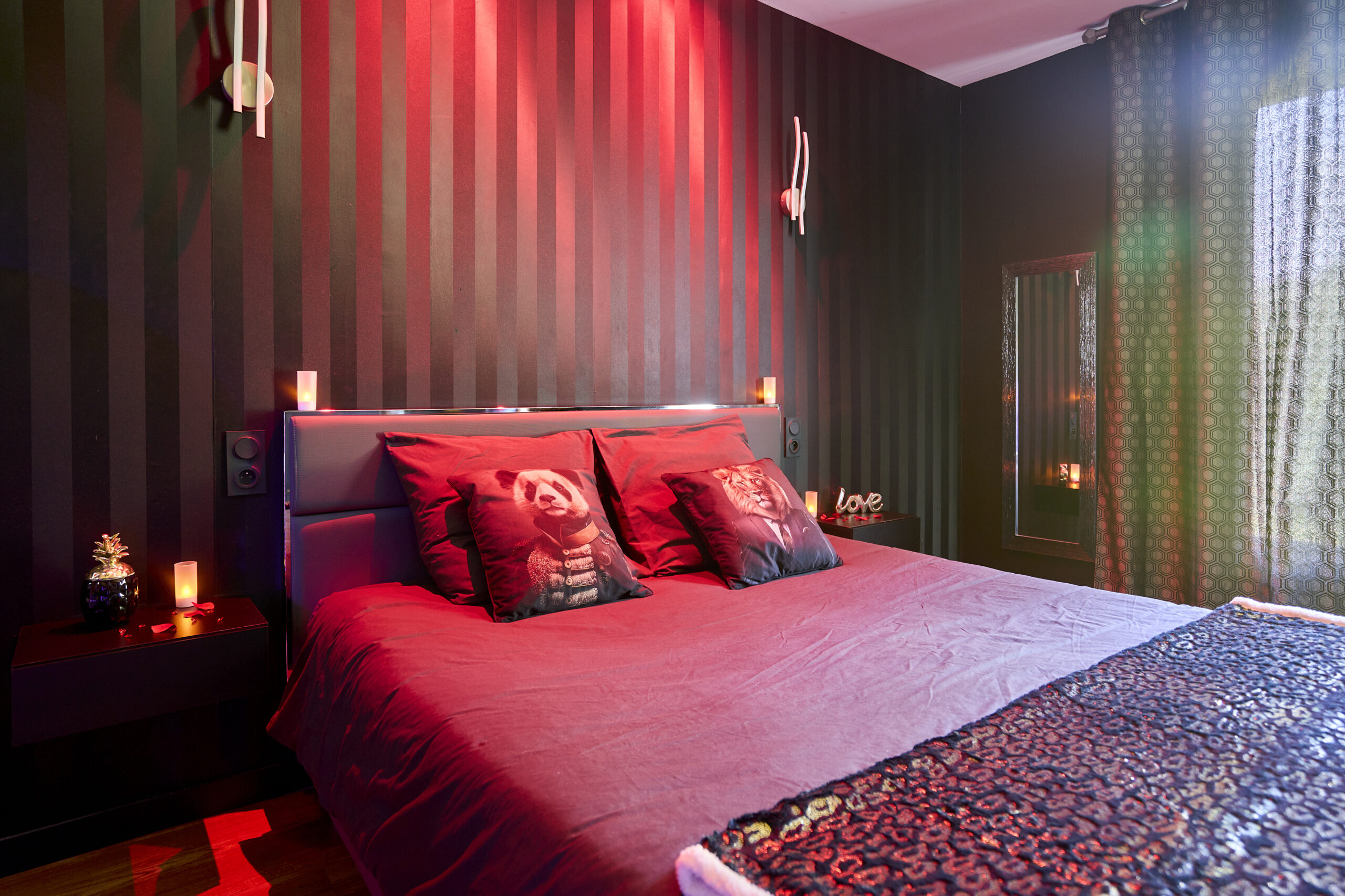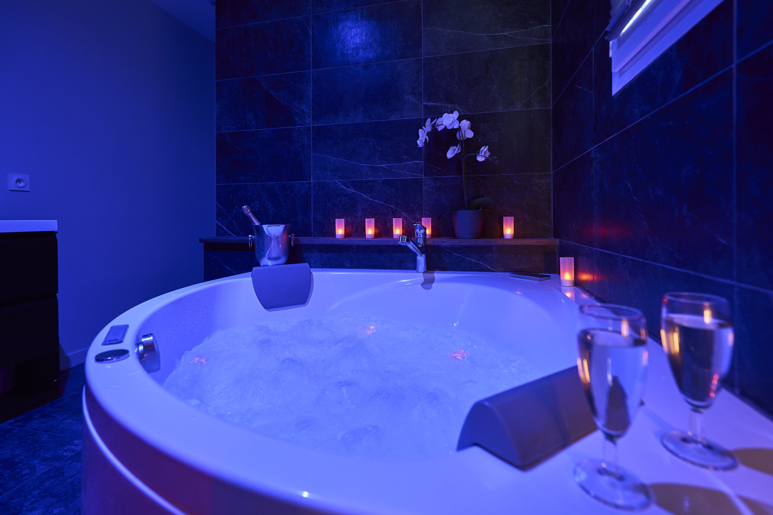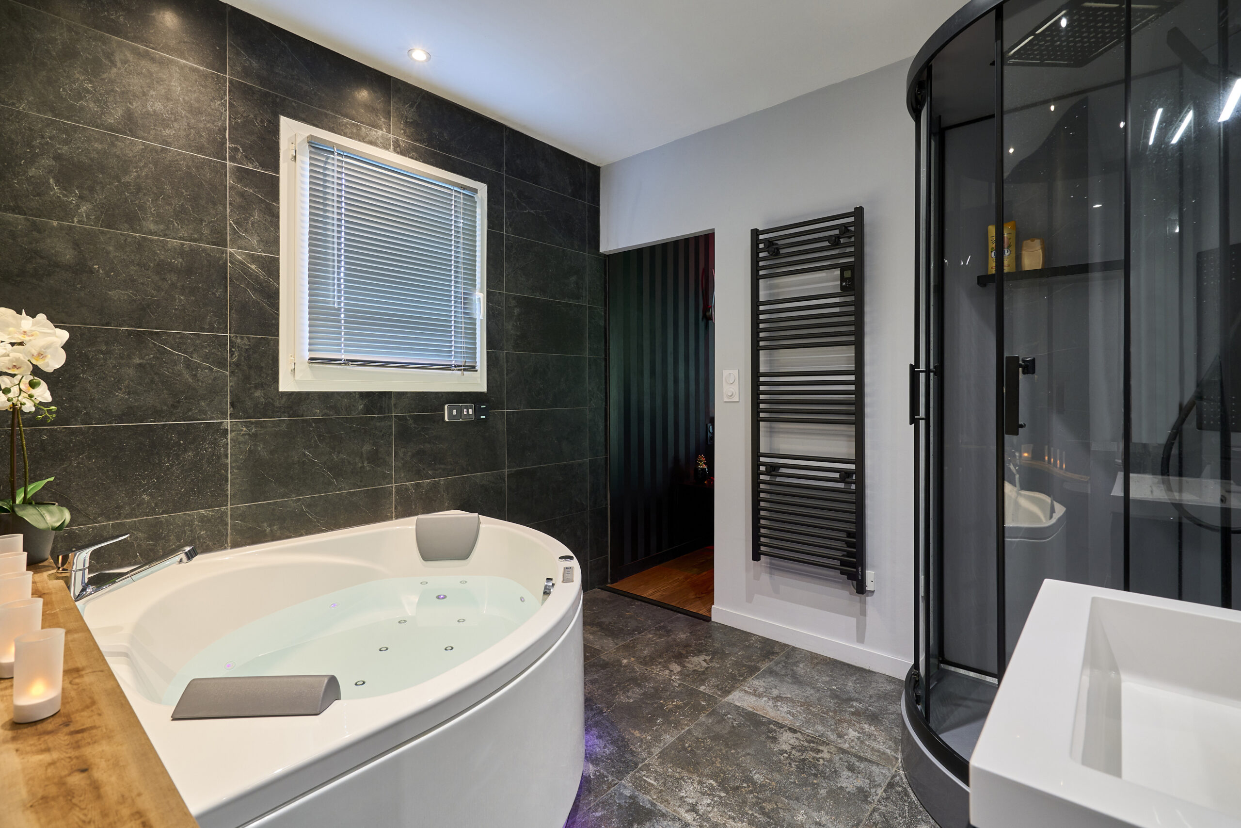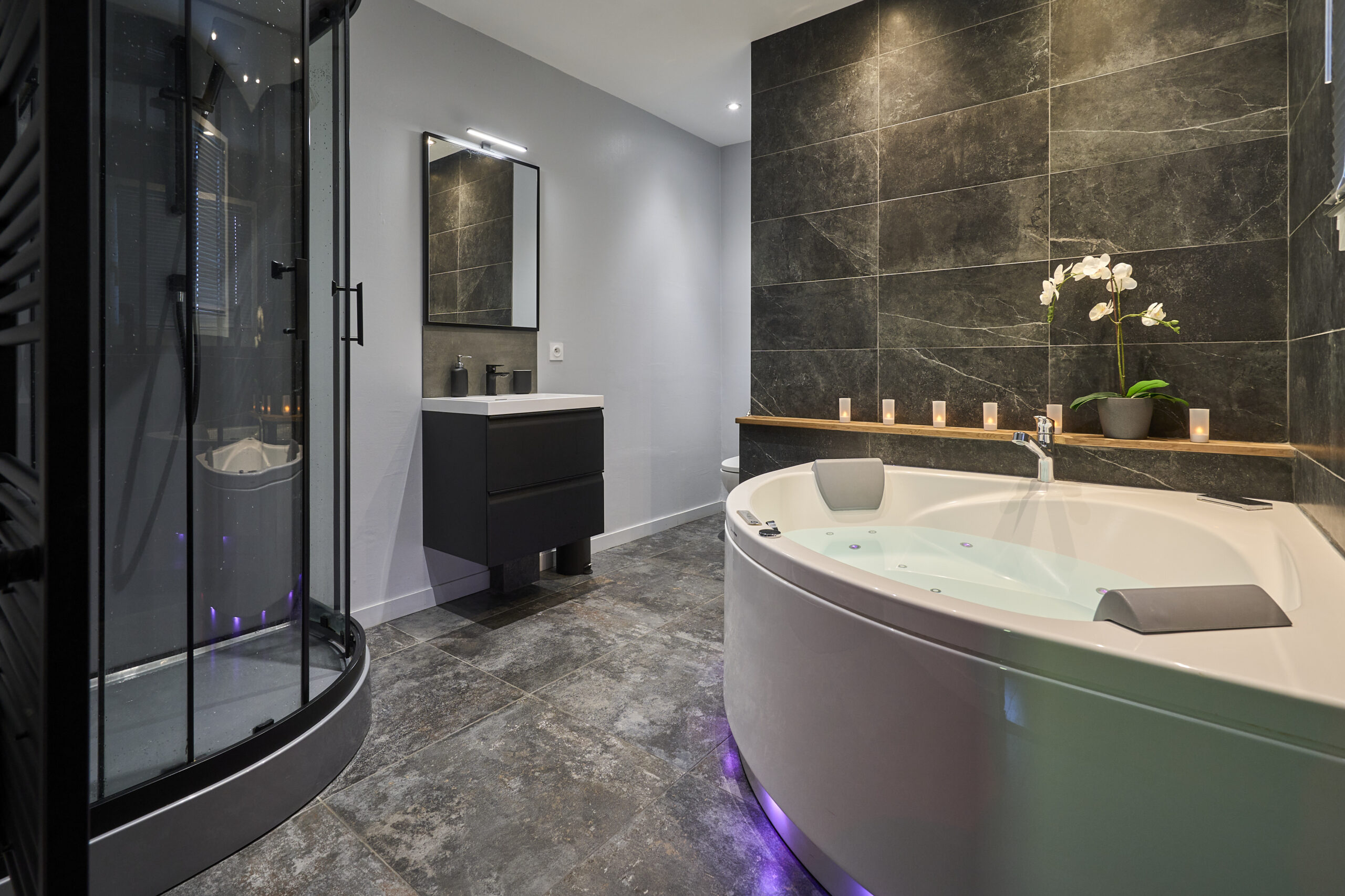 Ensuite, sa somptueuse salle de bain révèle tout le charme de cet endroit. Une baignoire balnéo pour deux personnes, agrémentée de chromothérapie, invite à une expérience de relaxation ultime. En effet, les douces lumières et les vibrations apaisantes de l’eau offrent un moment de tranquillité inégalé. Chaque bain devient ainsi un rituel de bien-être, un moment privilégié où le temps semble suspendu.